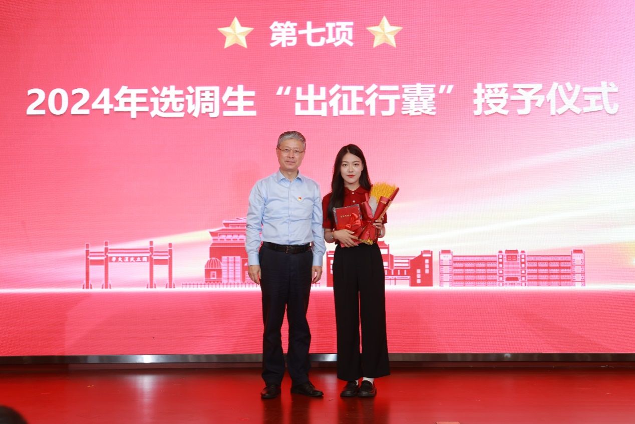 “黄书记在党课上对我们的殷殷嘱托、在活动前和我们的亲切合影以及活动中亲自给我们每个人授予的出征行囊让我们感受到了来自‘珈’的温暖,这份温暖将一路陪伴我们度过俯首田垄、扎根基层的选调生涯……”,即将出征的辽宁省选调生伍彩玉在活动现场谈到母校的临行关怀时不禁热泪盈眶。活动中,校党委书记黄泰岩为政治与公共管理学院2024届选调生依次授予“出征行囊”,22名即将出征选调生依次在“我们的选调足迹”地图上贴上扎根省份小红旗,表征着政管学子投身基层选调、心系家国天下的拳拳初心;出征行囊里精心准备的《习近平扶贫故事》和定制款《我的选调生日记》饱含着政治与公共管理学院的师生对即将出征的选调生永葆学习之志、书写青春华章的殷殷嘱托;出征行囊里别出心裁的“手捧麦束花”寄予着学校对政管选调生扎根田野沃土、体悟基层民生的真切期盼。