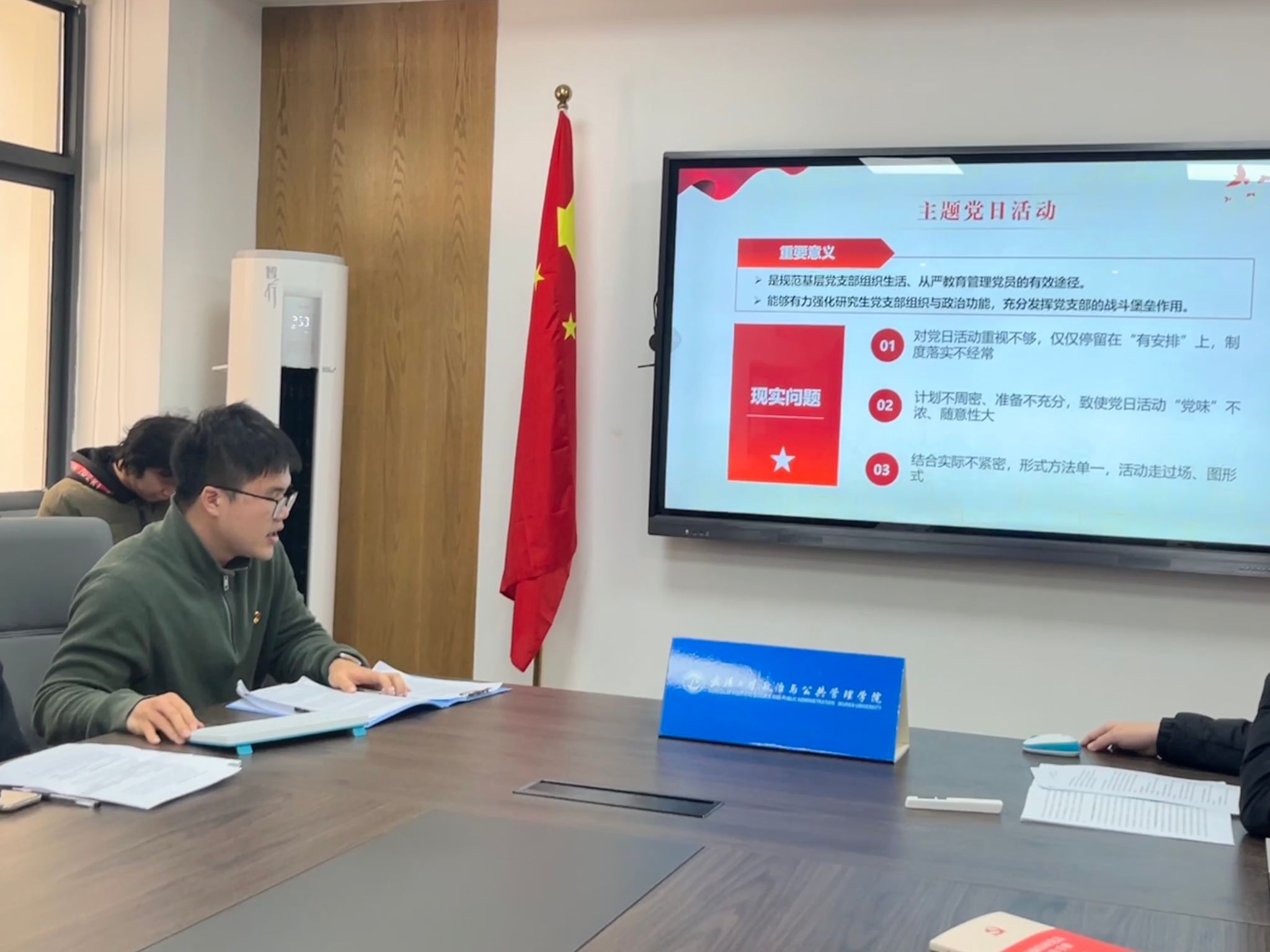 新任研究生党总支委员(学生)左鹏以“推进中国式现代化之‘政管担当’”联合党支部主题党日活动为样板案例,总结凝炼了“四个+”的支部党日活动建设路径经验。第一,推动理论+实践的有机结合。突出理论武装让党日活动有“深度”,强化实践导向让党日活动接“地气”。第二,推进形式+内容的创新发展。各支部应当采取“以创新载体为抓手”,不断创新支部理论学习和活动形式。第三,促进党建+业务的深度融合。各支部要将党日活动与学科专业相融合,避免党建与业务两张皮的困境。第四,实现支部+支部的加乘效应。各支部可以推进“薪火相传”“学科互鉴”“硕博共进”的多样化联合组队方式,紧密联合学院各级各类党支部,实现资源共享,优势互补,着力提升党建工作水平。