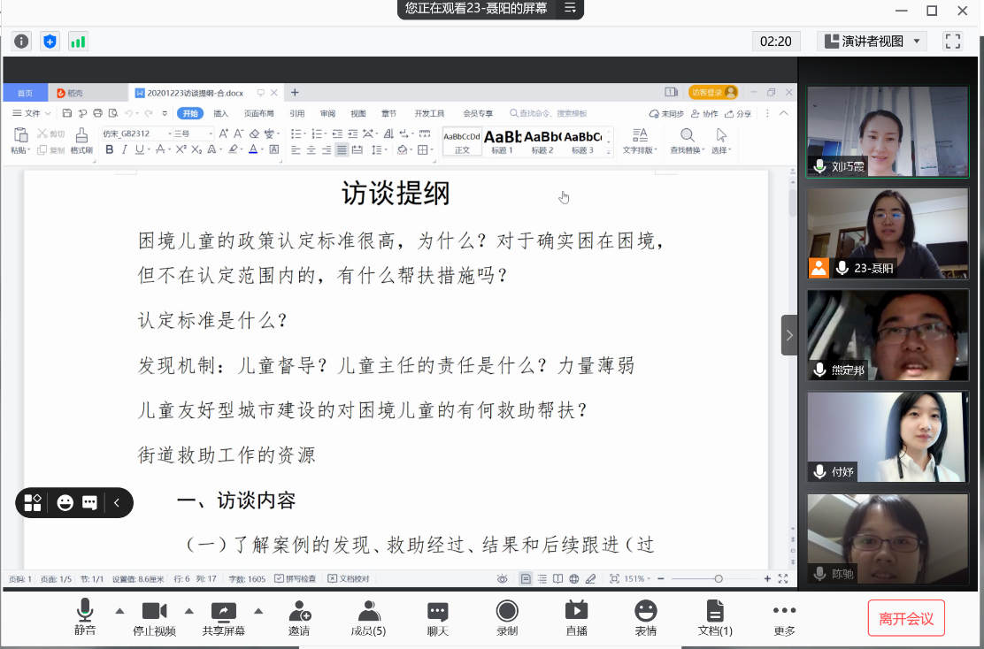 默契的分工协作也是成功的关键。我们配合资料搜集阶段和文章撰写阶段设置了两种分组方式。在资料搜集阶段,队伍分为三个小组同时行动:访谈组,负责联系案例相关方开展访谈,了解案例起承转合;政策搜集组,负责搜集国家、省、市、区困境儿童救助的政策及相关文献,摸清救助体系;问卷组,设计并发放问卷,了解市民对困境儿童救助的认知现状。在撰写阶段,队伍则分为案例正文和案例分析两个小组同步进行。队员们八仙过海,各显神通,让原本延后的进度提速;分工明确,商讨切磋,使案例的最终成稿趋于完善。