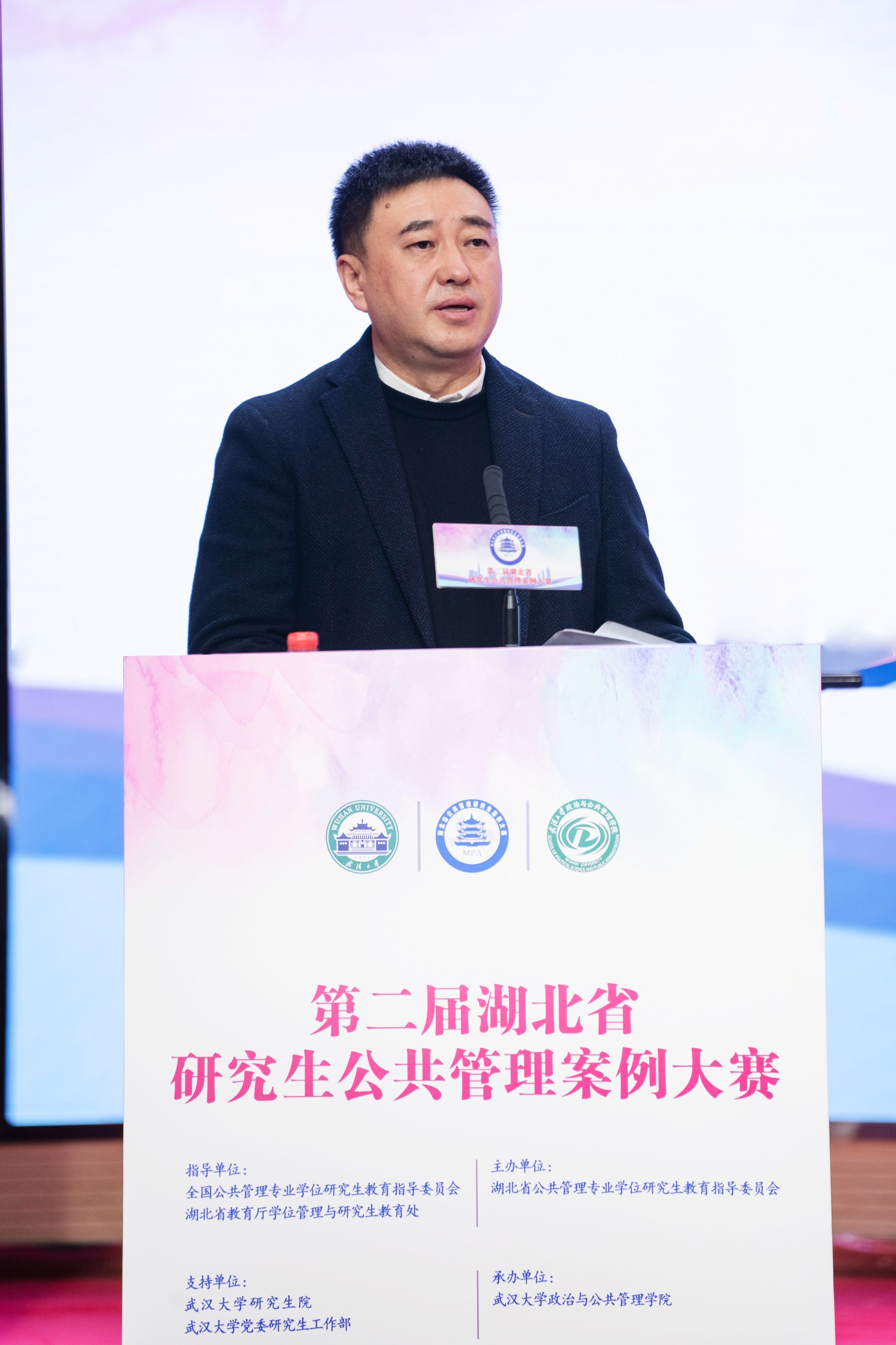 全国MPA教指委秘书长、中国人民大学公共管理学院院长严金明教授代表全国MPA教指委致辞。他首先向湖北省MPA教育取得的优异成绩表示热烈祝贺,并充分肯定了武汉大学在20余年的MPA教育中所取得的办学成绩。随后他介绍了案例教学和案例大赛在MPA教育中的关键作用,呼吁案例大赛和案例教学要积极服务于中国自主公共管理知识体系的构建。最后,他表达了对参赛选手的希冀,愿每一位参赛选手都能收获满满的知识和成长。