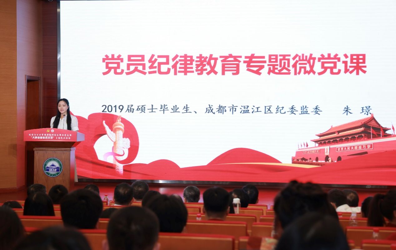 政治与公共管理学院2019届四川省选调生、成都市温江区纪委监委朱璟校友主动请缨,从工作实务角度为毕业生讲授党员纪律教育专题微党课。她通报了中央纪委国家监委、省、市级纪委监委通报曝光的一批80后、90后年轻干部严重违纪违法典型案例,在深入剖析案例特点和形成原因的基础上,提醒即将步入选调生队伍的学弟学妹们以案为鉴、警钟长鸣,扣好廉洁从政的“第一粒扣子”,守住守牢拒腐防变防线。
