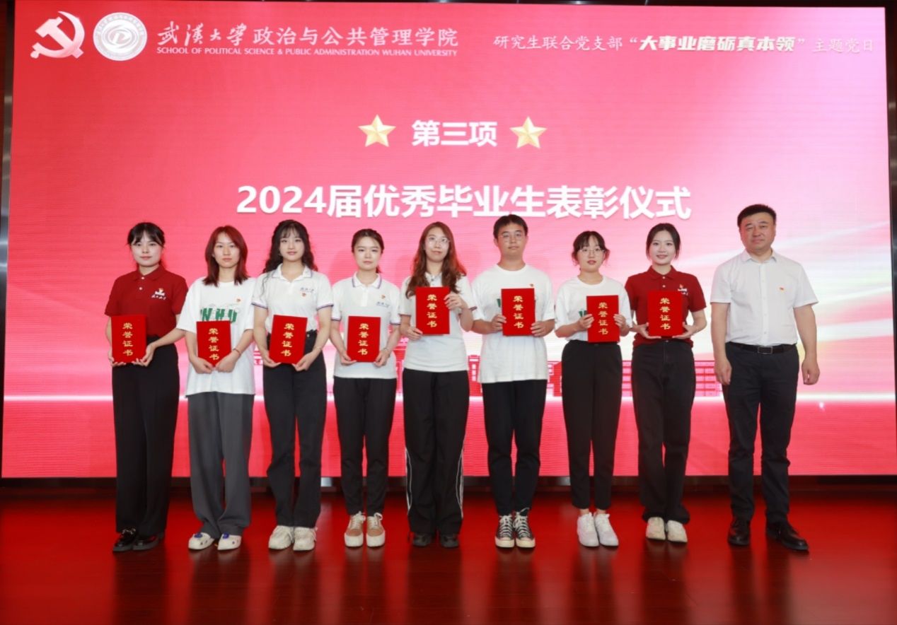 校党委副书记屈文谦为政治与公共管理学院2024届优秀毕业研究生颁发表彰证书。选调生代表郭昕欣在交流分享中讲述了她选择加入选调生队伍的心路历程,并根据自身经历提出三点建议与毕业生共勉:她号召大家要淬砺初心,坚定理想信念,播下“初心种”;要投身一线,扎好“实践根”;要勤勉奋斗,绽放“奉献花”。她代表全体选调生郑重表态:要做一名能吃苦肯奋斗的武大选调生,深耕基层、永葆忠诚,让青春在党和人民最需要的地方绽放绚丽之花。
