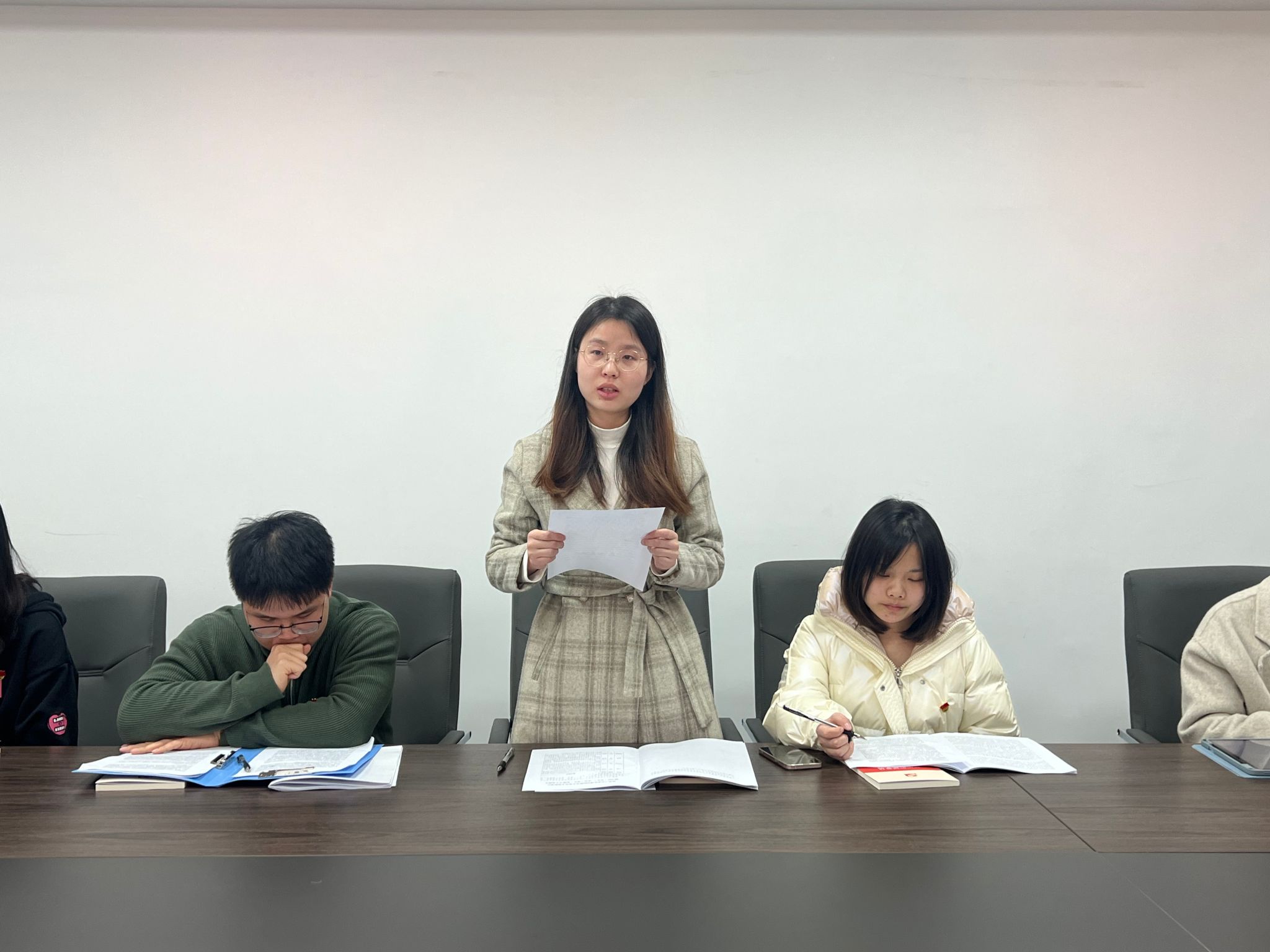 研究生党总支委员(学生)栾一晴介绍研究生党总支副书记(学生)、委员(学生)提名人选基本情况。经个人报名,学院党委酝酿,拟提名左鹏、周诗睿、夏玲、黄晨馨任研究生党总支委员(学生),经研究生党总支和全体研究生党支部书记表决,同意以上任职提名。