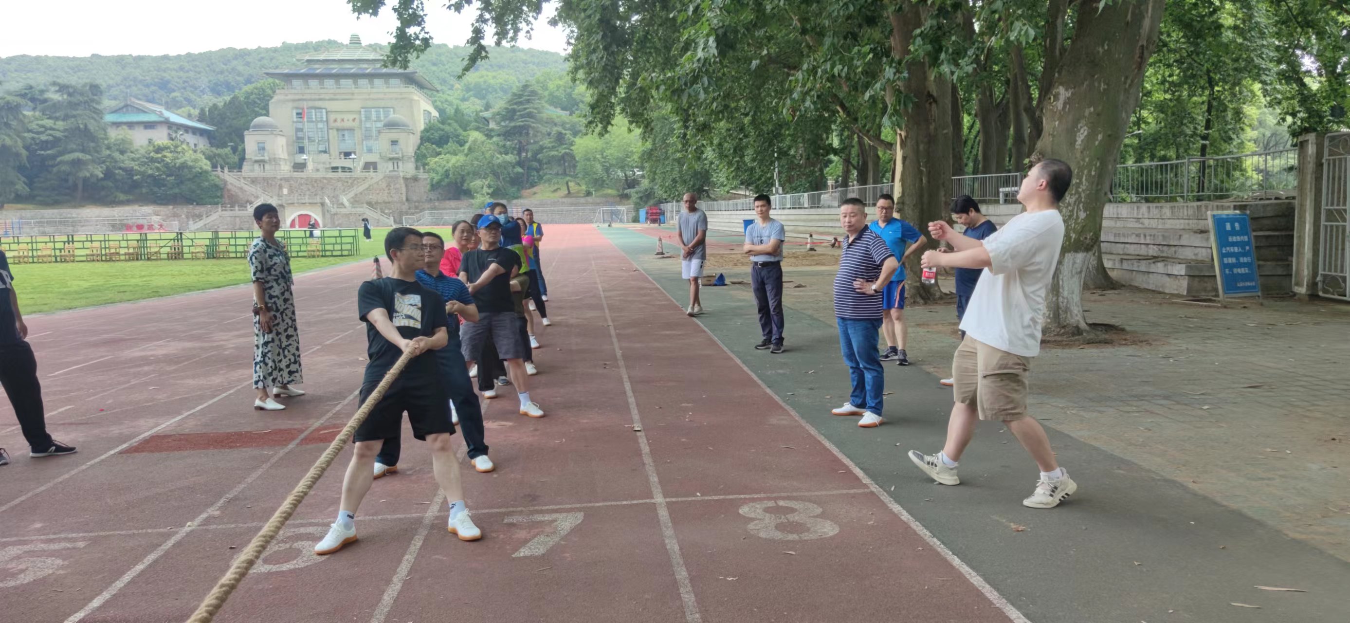 这场胜利确实来之不易,学院拔河比赛一直在乙级队徘徊,成绩不尽理想。第一场小组赛对阵网安学院,面对师生规模相当,实力不相上下的对手,第一局出其不意取得胜利,但后继乏力,在整体队伍更加年轻的对手持续攻势下败下阵来,以1:2输掉了小组首场比赛。是偃旗息鼓甘做“陪练”,还是抖擞精神为己正名,全体政管人用实际行动做出了选择。学院工会在党委的坚强领导下,充分发挥凝聚团结教职工作用,迅速在全院范围内进行再次动员,发动更多教职工参与其中,同时认真总结首场比赛经验,认识到在自身硬件劣势的情况下要充分发挥技术上的优势,才有可能在强者如林的竞争中拼出一条血路。学院工会迅速行动,邀请上届比赛亚军—机关队的教练和主力队员进行实地指导,机关队的“老师们”亲临观看了队员的模拟训练后,敏锐地发现了不足,首先调整优化队伍结构,根据大家的身体素质情况调整了人员组成和站位顺序;其次指导改进错误动作,一对一纠正并要求形成肌肉记忆;再次精准改良指挥口令,使指挥员口令与运动员动作高度协调统一;最后量身制定比赛策略,优势在我则一鼓作气敌众我寡则防守反击。见贤思齐,虚心学习是所有政管人的优秀品质,大家在认识到不足之处后果断行动,在912操场的正午烈阳下抓紧训练,一步一滴汗水一步一个脚印,机关队的教练们在感受到大家的努力后,也不禁赞叹“政管院的老师们领悟力强、行动力强、创造力强,冲甲必定胜券在握”。