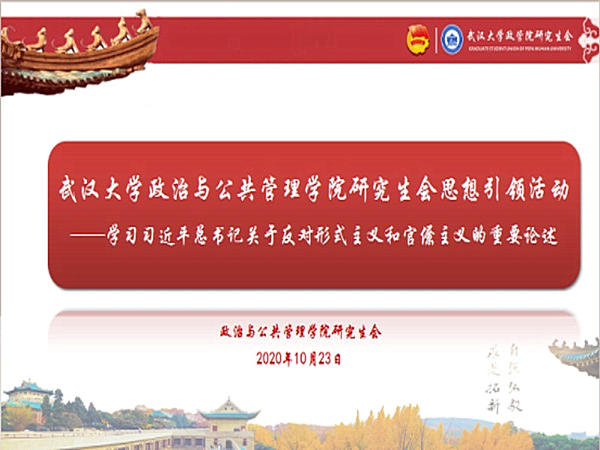 2020年10月23日下午,我院研究生会全体成员于学院216会议室开展了一次富有意义的理论学习活动,本次活动以“反对形式主义和官僚主义”为主题,深入领悟学习习近平总书记关于反对形式主义和官僚主义的重要论述。本次活动由研会秘书处成员李欣玥同学主持,我院研究会全体成员积极参与、并进行了深入的讨论。