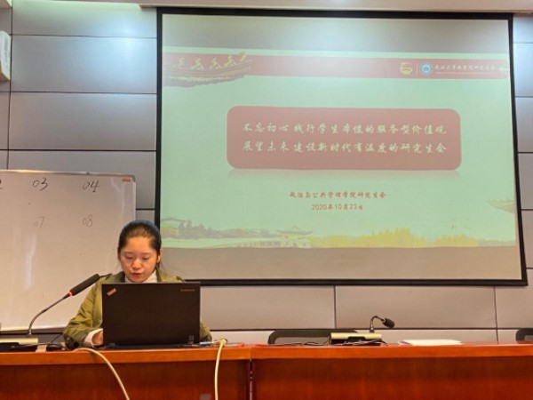 最后,秘书处李欣玥同学讲述了研究生会的角色定位,将其定位于自我服务、自我管理、自我教育、自我监督的学生组织,需要摒弃官僚主义等不良作风,并提出了我院研会学生骨干建设的要求,第一,要着力加强思想建设,端正组织风气;第二,要着力提升专业学习,引领学习风气;第三,要着力拓展工作能力,营造团队风气。